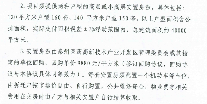 根据协议,项目须提供两种户型的高层或小高层安置房源,具体包括:120平方米户型160套、140平方米户型150套。安置房源由泰州医药高新技术产业开发区管理委员会或其指定的单位回购,回购单价9880元/平方米(签订回购协议,回购协议与本协议具体同等效力)。
