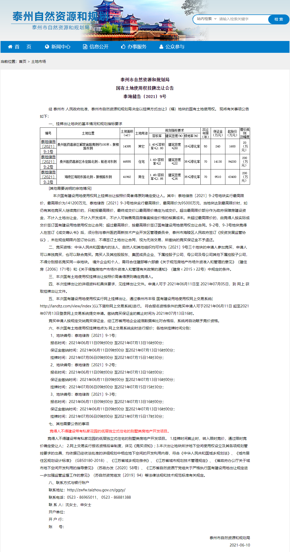 2021年6月10号,泰州市自然资源和规划局决定以挂牌方式出让3(幅)地块的国有土地使用权。总出让面积超12万方,最高楼面限价12238元/平。详情如下: