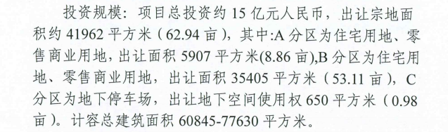 投资规模:地块出让宗地面积约41962平方米(62.94亩),其中分为:A分区为住宅用地、零售商业用地,B分区为住宅用地、零售商业用地,C分区为地下停车场。