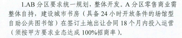 AB分区要求统一规划,整体开发。A分区零售商业需整体自持,建设城市书房,具备24小时开放条件的场馆型自助公共图书馆,在签订土地出让合同18个月内投入运营。