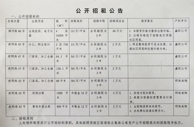 1、招租原则:上处场所租赁实行公开招标的原则,具体按照西陵区窑湾街办集体公有资产公开招租规定的招租程序执行。