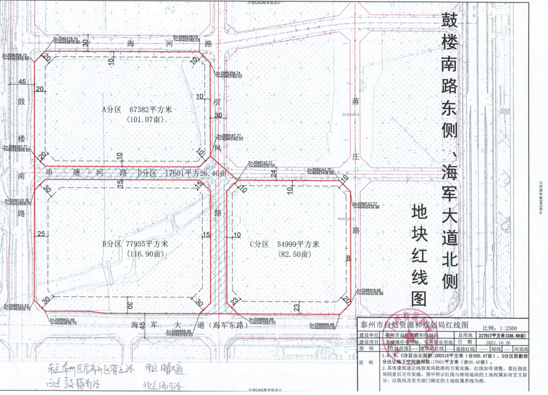 四至范围:东至泰州医药高新区钟山路、南至淮河路、 西至泰州大道、北至海军大道