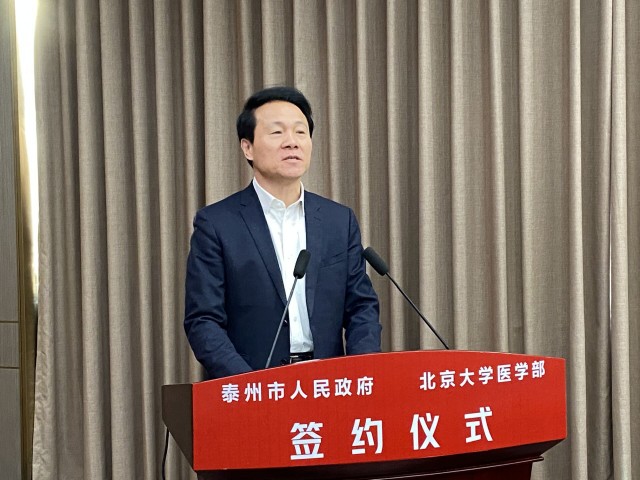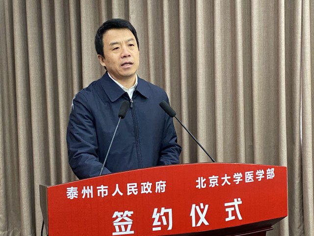 史立军说,总书记在党的十九届五中全会上提出了“全面推进健康中国建设”的重大命题。去年,党中央、国务院发布的《长江三角洲区域一体化发展规划纲要》中明确提出“培育泰州医药健康产业创新中心”。北京大学医学部历史悠久,学科实力雄厚,科研成果丰硕,是国内最重要的医学创新研究基地和培养高级医药卫生人才的高等学府之一。希望双方以此次签约为起点,进一步加强沟通交流、推动优势互补,加快在项目合作、人才交流等方面实现新突破、取得新成果。我们将致力最优服务、最强保障、最佳配套,全力为北京大学医学部科研创新成果转化、学科内涵建设与外延发展等营造一流环境。我们也期待与北京大学医学部一道,共同落实好协议的各项内容,推动合作不断迈向更深层次、更宽领域、更高水平,携手谱写互惠互利、共赢发展的新篇章。