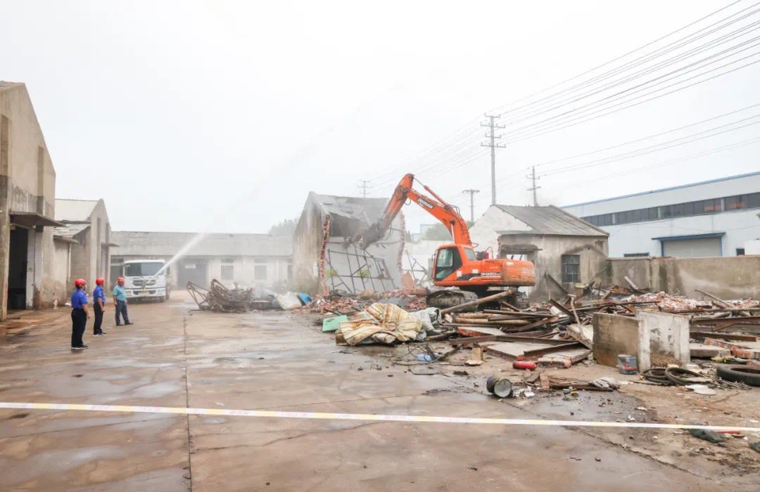 在溱潼生态工业园区低效闲置企业协商搬迁项目现场,工作人员正在拆除已搬迁企业厂房。同时,该镇还积极推进利达兴盛金属材料、玉辰重工、丰坤电气等项目落地,预计亩均税收可达25万元。
