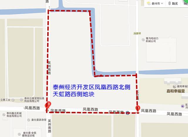 泰州经济开发区凤凰西路北侧、天虹路西侧地块。四至范围:东至天虹路、南至凤凰西路、西至吴州路、北至汤家河,规划用地面积约46667平方米(70亩)。