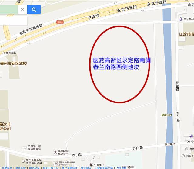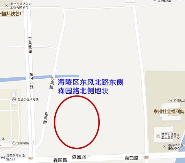 海陵区东风北路东侧、森园路北侧地块。四至范围:东至春云路、南至森园路、西至东风北路、北至道路,规划用地面积约133333平方米(200亩)。