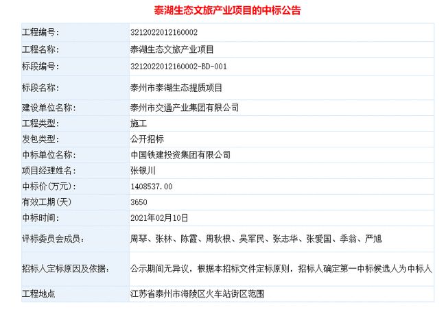 2021年2月10日,泰州市公共资源交易中心公示了《泰湖生态文旅产业项目的中标公告》。